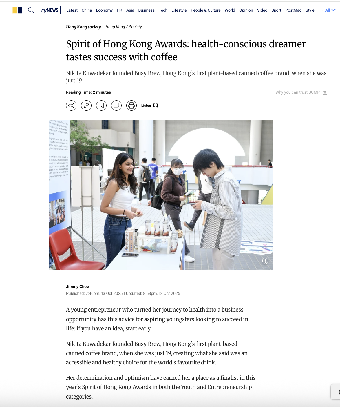 A finalist in the Youth and Entrepreneurship categories, founder Nikita Kuwadekar shares how a teen heart surgery and a search for gentler coffee led her to launch Busy Brew at 19- Hong Kong’s first plant-based canned coffee- and her advice to “start early.”